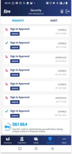 This is why we require account activity such as logging in or adding a new payee to be approved using the Fire for business mobile application. Linking your mobile device allows us to send you a push notification so you can authenticate and approve such account activity.