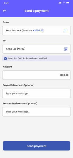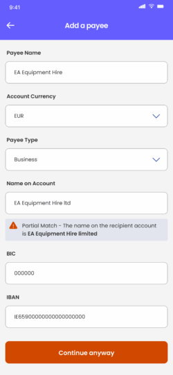 Verification of Payee is an account name checking service designed to help reduce misdirected payments, and provides greater assurance that payments are being sent to the intended account holder for SEPA payments. This includes all payments to and from Fire euro accounts.